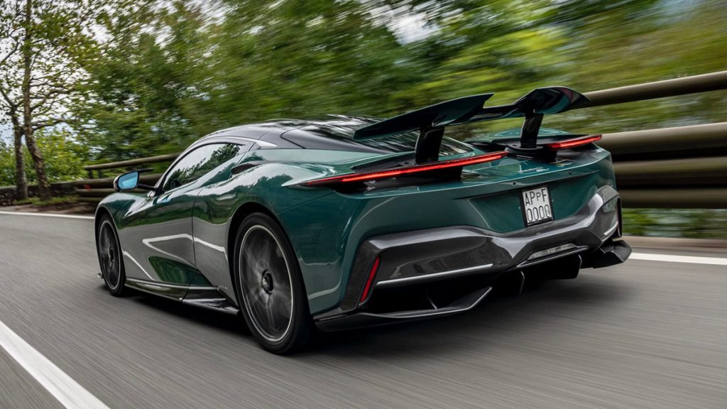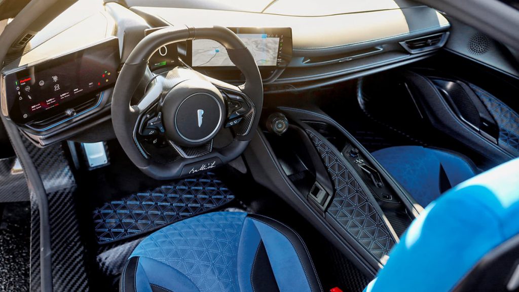 These performance levels are delivered alongside an electric range of over 500 km on a full charge, thanks to the car’s 120 kWh battery pack, mounted within a solid T-shaped carbon frame low down in the chassis.