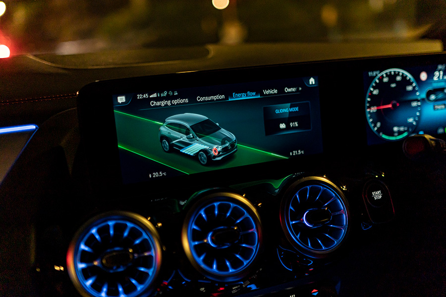 The interior is mostly standard Mercedes, which many people will likely approve of. One of the key features is ambient lighting on the dashboard around controls such as the air vents, which, in blue, look very appropriate for an EV (up to 64 colours can be selected). Turn up the dial on the interior lighting too far, however, and light reflecting in the door mirrors can distract you when reversing in the dark.