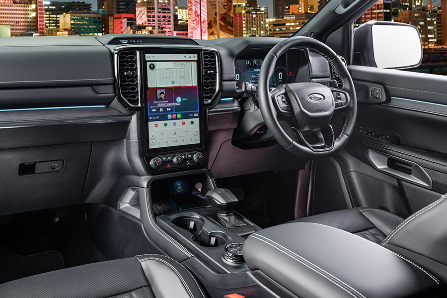 Enter the cabin, and you will be treated to a more upmarket interior, noting the quilted and stitched leather seats, which have heating and cooling for the front seats. The model also boasts a 12.4″ infotainment screen, which is larger than that found in the other Ranger models. Since we are fast approaching winter, the steering wheel comes heated as standard with the Platinum model.