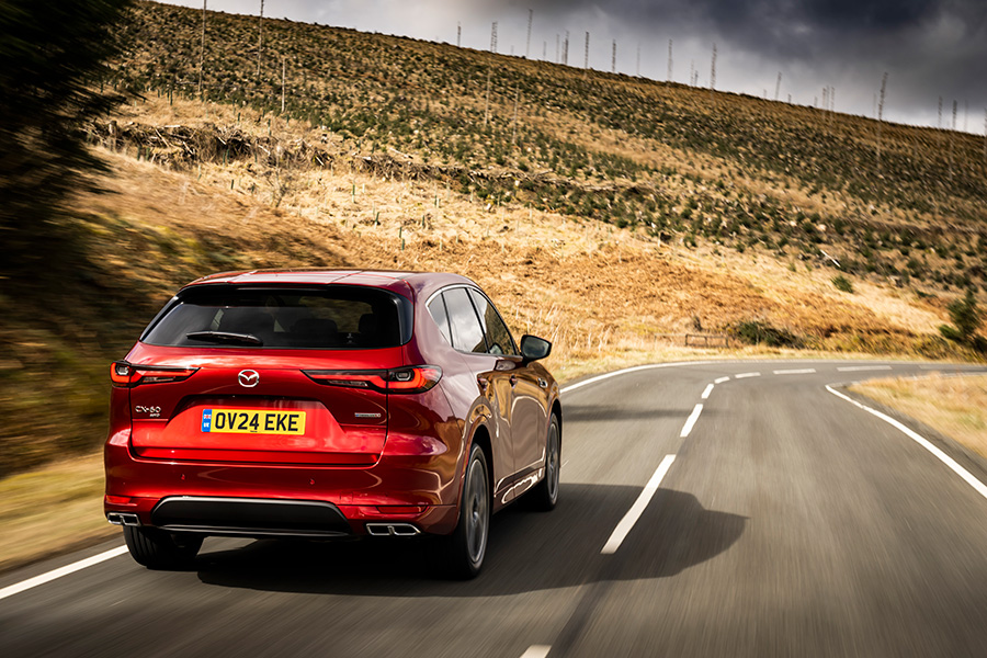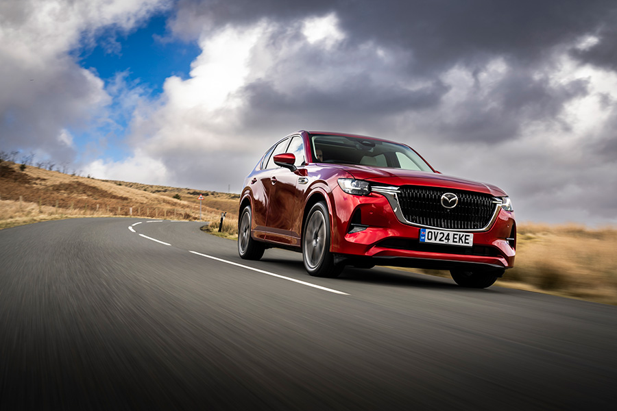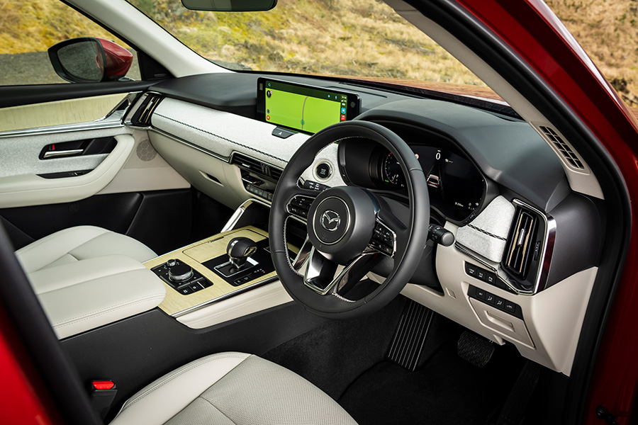 The turbodiesel mill (basically Mazda’s 2.2-litre four-cylinder with two cylinders added) churns out a formidable 178 kW and 550 Nm of twisting force. The mild-hybrid system (consisting of a 0.33 kWh lithium-ion battery pack and electric generator) adds an extra 12.4 kW and 153 Nm of torque for about 20 seconds when fully charged.