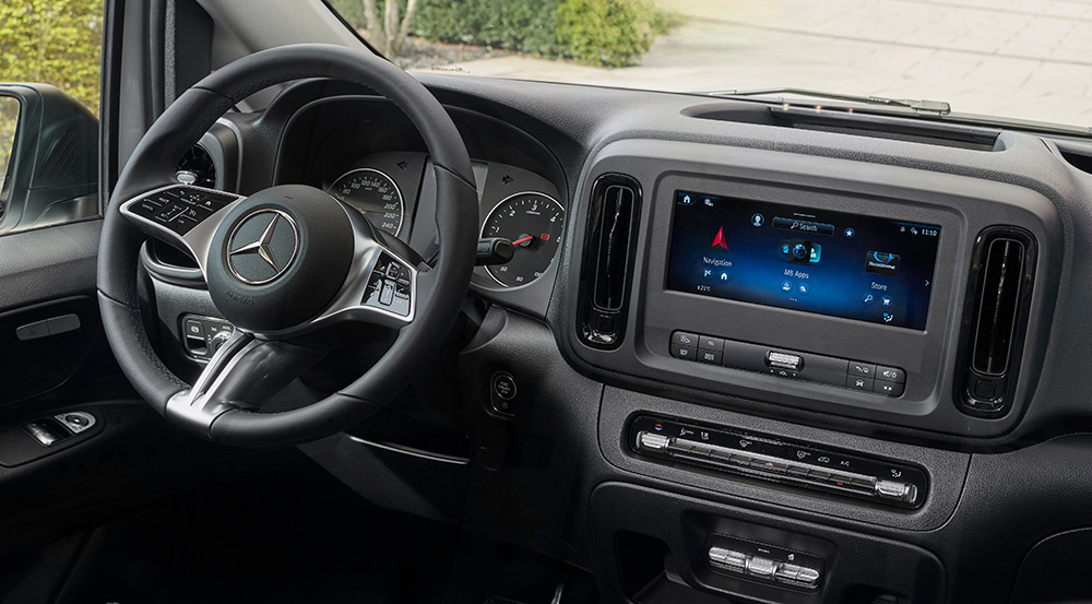 For the first time, the new Vito includes the MBUX (Mercedes-Benz User Experience) infotainment system as standard in all variants, bringing state-of-the-art digital networking to the midsize commercial van segment. The Vito now features a 10.25” central display that can intuitively operate by touch. The instrument cluster has a colour display that clearly shows all relevant information and can be conveniently operated using the touch control panels on the new steering wheel. Modern digital connectivity, including a wide range of Digital Extras, further enhances comfort and relaxed driving for commercial customers.