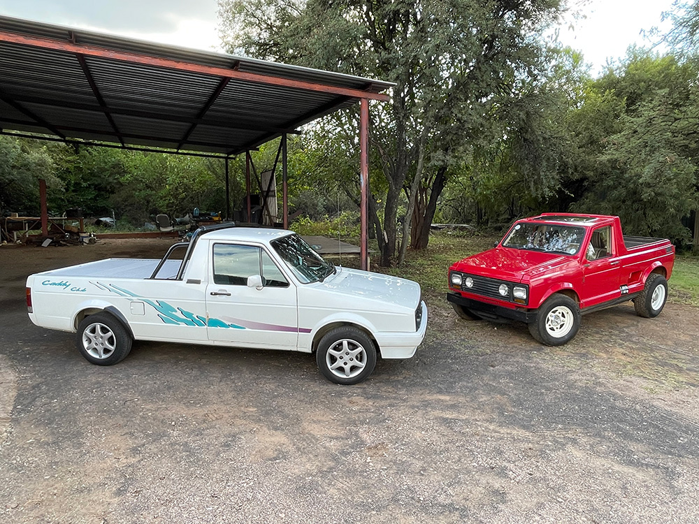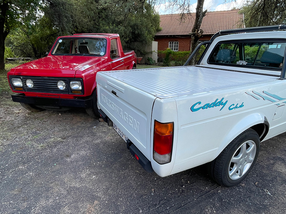 Parked together, it is clear to see how the angular lines of the Project 1021 bakkie were most likely influenced by the original Golf and carried over to the Caddy, but they are entirely different in terms of mechanical layout; the Caddy following the conventional front-engine rear-wheel-drive route (leaving a large 1.83 m load bed).