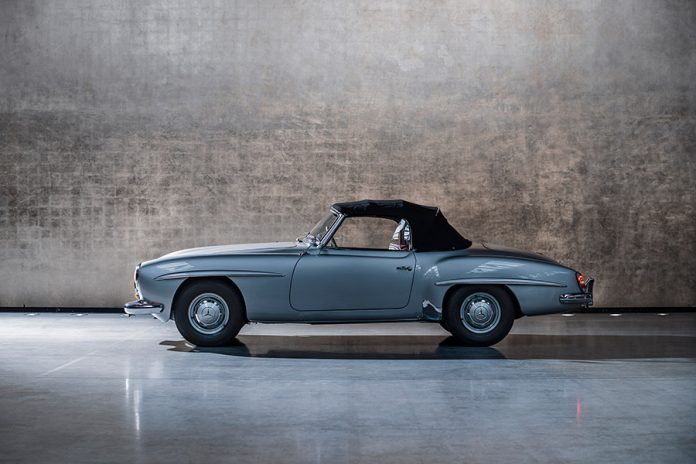 Produced by Mercedes-Benz between May 1955 and February 1963, a total of 25,881 units of the W121 190 SL were built. Sharing the basic styling, engineering, detailing, and fully independent suspension of the 300 SL, the smaller-engined two-door roadster used a modified and shortened floor pan from the W121 base saloon, and not the expensive purpose-built W198 tubular spaceframe of the 300 SL.